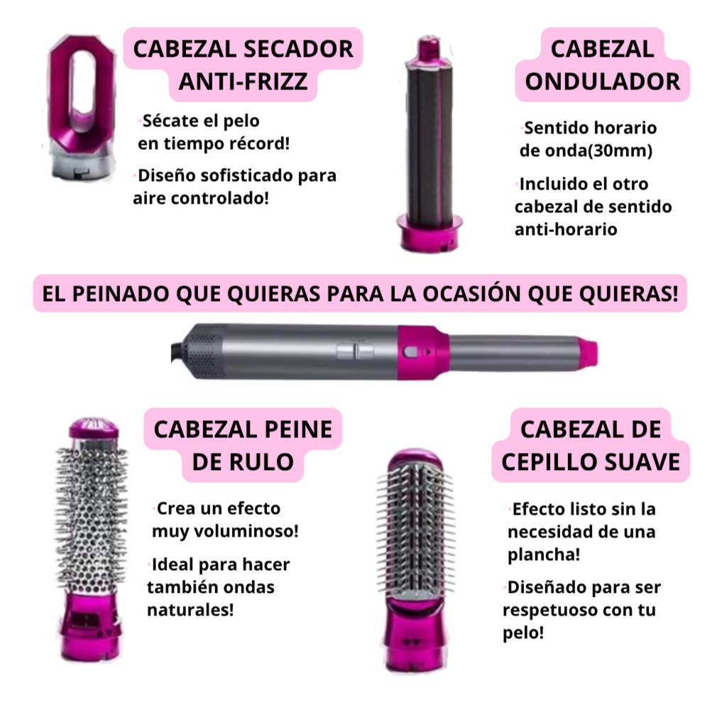 Multifunción 5 en 1 | Seca, alisa y riza con un solo toque. Su tecnología avanzada protege tu cabello mientras le da brillo y volumen de peluquería. ¡Luce un peinado perfecto cada día sin esfuerzo!