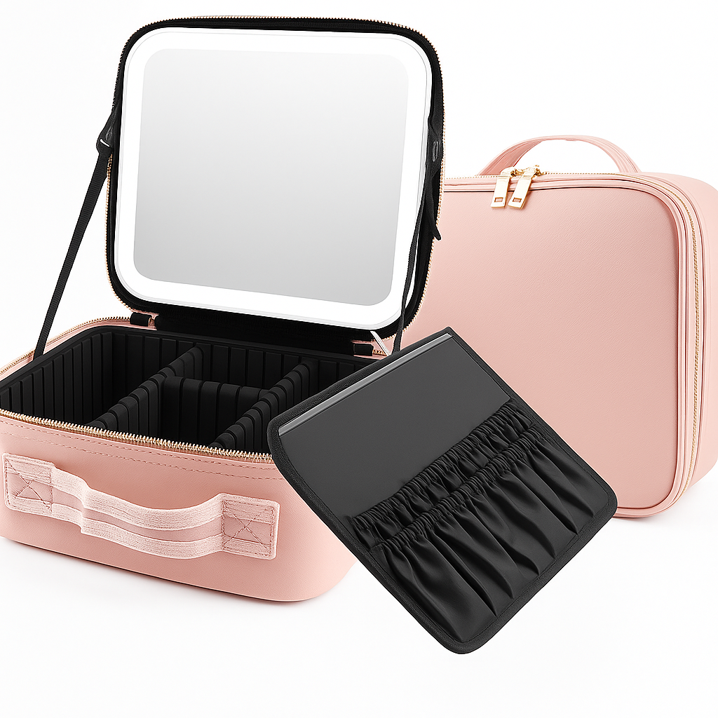 Neceser organizador con espejo LED | Guarda y protege tu maquillaje con estilo! Incluye compartimentos ajustables, bolsillo elástico y un espejo iluminado ideal para maquillarte donde quieras. Compacto, elegante y perfecto para viajar con todo lo que necesitas.